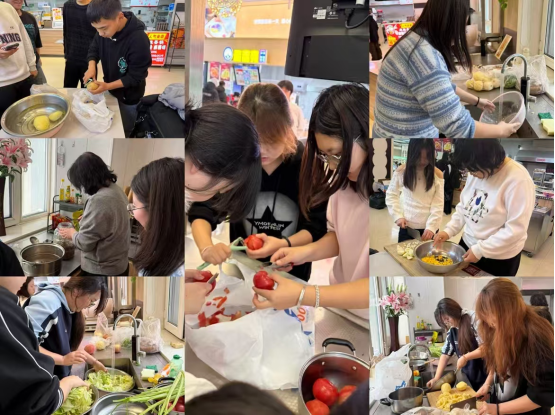 活动伊始,食堂的操作区便被同学们的热情填满,俨然变成了热闹的“俄式厨房”。同学们自发分工协作,每个人都化身“小厨师”,忙得不亦乐乎。有人专注地削着土豆、切着圆白菜,为制作经典的俄式红菜汤准备核心食材,手中的刀具在砧板上发出规律的切菜声;有人细心剥着鸡蛋、将烟熏香肠切成均匀的薄片,搭配全麦面包制作俄式经典配餐,每一个步骤都做得一丝不苟;还有人认真清洗梨、番茄等食材,为调配俄式沙拉和制作甜品做准备,指尖的细致尽显对食材的用心。
